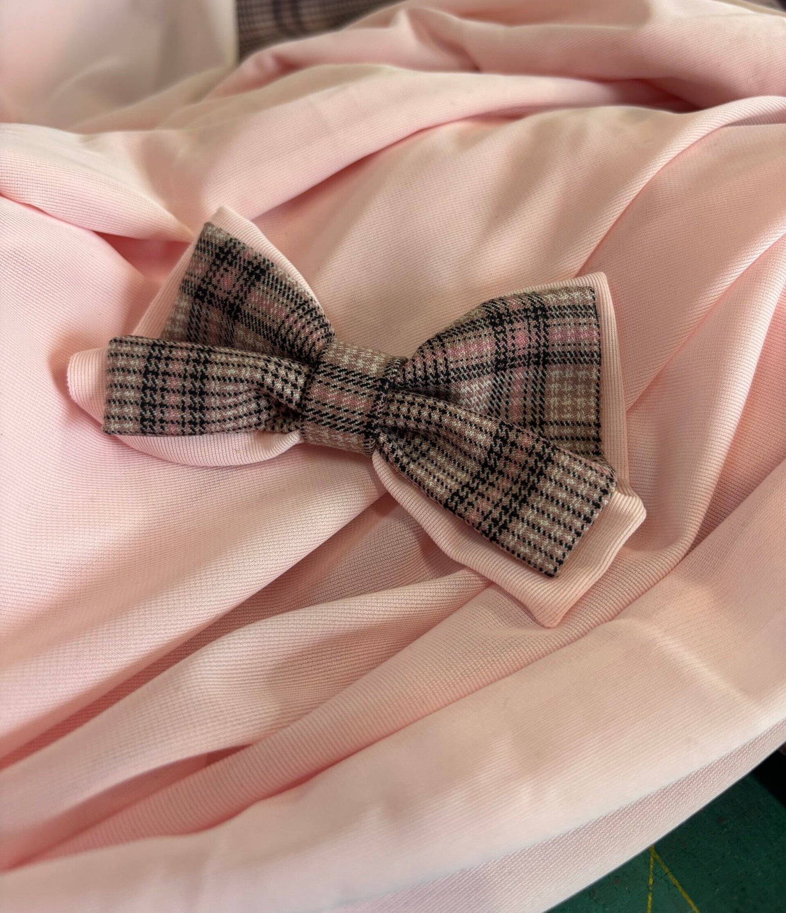 Handmade pink check Dog Bow, made in London using sustainable end-of-stock fabric. Limited edition, easy to attach, perfect for stylish everyday wear. 🎀